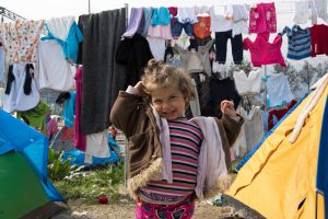 Figure 2 – EIDOMENI, GRECE – 17 mars 2015: Une petite fille sourit devant sa tente dans le camp de réfugiés.